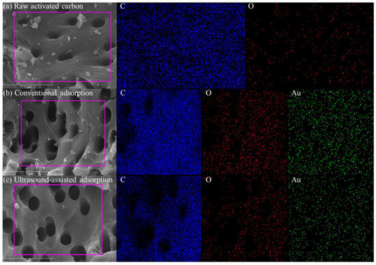 SEM images and main element distribution for raw activated carbon (a), activated carbon after conventional adsorption (b), and after ultrasound-assisted adsorption (c).