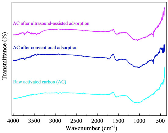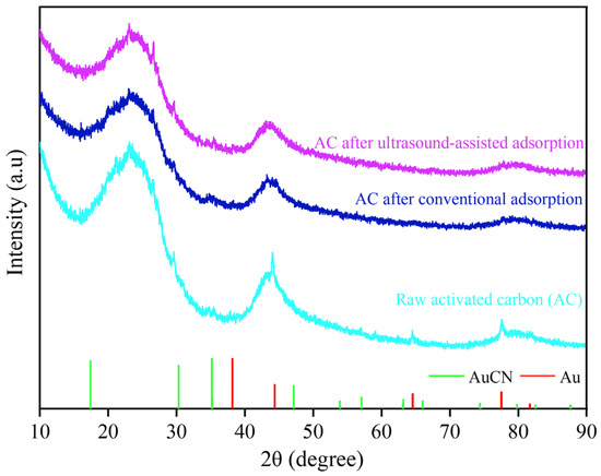 SEM images and the main element distribution of the activated carbon before and after adsorption are shown in Figure 9. There is no obvious difference in the surface morphology of the activated carbon before and after adsorption, which is an uneven and porous structure. The surface scanning results of the activated carbon before adsorption showed that its surface was mainly composed of C and O elements, where C is an inherent element of activated carbon, and O may come from metal oxides or non-metal oxides produced during the preparation of the activated carbon. The surface scanning results of the activated carbon after conventional and ultrasound-assisted adsorption showed that Au elements were evenly distributed, indicating that Au had been adsorbed on the activated carbon. The X-ray diffraction analysis of the activated carbon before and after adsorption is shown in Figure 10. The diffraction peaks of the activated carbon are broad and belong to amorphous carbon, which has not yet fully formed the crystal structure of a graphite layer. No obvious new diffraction peaks appeared after adsorption, indicating that the loading of Au(CN on the activated carbon was below the XRD detection limit. The FT-IR spectra of the activated carbon before and after adsorption are shown in Figure 11. There is no obvious change in the infrared spectra of the activated carbon before and after adsorption, which potentially arises from the low content of Au(CN loaded on the surface of the activated carbon.