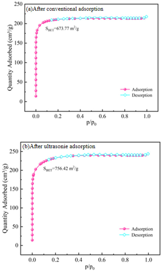 The nitrogen adsorption–desorption technique was applied to analyze the BET specific surface area of the activated carbon before and after adsorption, and the results are shown in Figure 12. Following the classification system of adsorption isotherms by the International Union of Pure and Applied Chemistry (IUPAC), the nitrogen adsorption–desorption isotherm of the activated carbon belongs to type I, demonstrating that the coconut-shell activated carbon used is a microporous material. According to the nitrogen adsorption–desorption curve, the BET specific surface area, pore size, and pore volume of the activated carbon before and after adsorption were calculated. As shown in Table 9, the BET specific surface area of the activated carbon increased from 667.1 mg/g to 756.4 mg/g after ultrasound-assisted adsorption, while the BET specific surface area of the activated carbon remained basically unchanged after conventional adsorption. The particle size distribution of the activated carbon after conventional and ultrasound-assisted adsorption was analyzed, and the data are tabulated in Table 10. The initial particle size of the activated carbon was 1180–1700 μm, and about 12.8% of the activated carbon particles were less than 1180 μm after ultrasound-assisted adsorption, while only 4.5% of the activated carbon particles were less than 1180 μm after conventional adsorption. Based on these results, part of the activated carbon is refined under the action of ultrasonic waves, the specific surface area is increased, the surface diffusion and external mass transfer rate is accelerated, and the adsorption sites are increased, which leads to the enhanced adsorption capacity of activated carbon for Au(CN under the ultrasonic action [29,30].