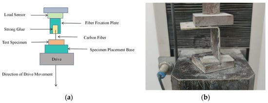 The single-fiber pull-out loading process is shown in Figure 4. The test loading is performed using a universal testing machine at a rate of 0.2 mm/min. Since the load on a single fiber being pulled out is very small, a high-sensitivity, high-precision load sensor is required. The procedure involves fixing the test specimen to the base using adhesive, rotating the specimen base to adjust the specimen’s position so that it is close to the fiber fixing plate, and carefully attaching the free end of the fiber to the fiber fixing plate with adhesive. After the preparation, the universal testing machine is activated for the pull-out process, and five valid data points are taken for each group of tests.