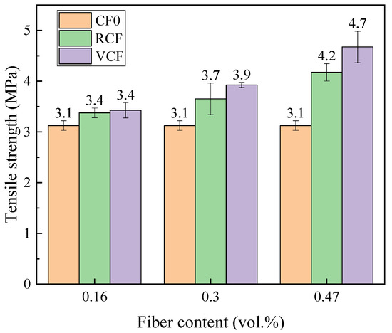 In engineering structural design, although cementitious materials primarily withstand compressive stress, tensile regions inevitably arise in practical situations, especially when components are subjected to bending or shear forces. The tensile strength directly impacts the durability and safety of the structure. Figure 5 shows the 28-day tensile strength of cementitious materials reinforced with RCF and VCF. As shown in Figure 5, RCF significantly enhances tensile strength, with an increase corresponding to higher fiber content. RCF improves the tensile strength of the specimens by 8.80% to 35.48%. Cementitious materials are brittle, and when subjected to tensile forces, internal microcracks tend to propagate, leading to rapid material failure. The incorporation of RCF effectively suppresses crack propagation. When cracks form near the fibers, the fibers bridge the cracks, delaying their growth, and thereby improving the material’s toughness and tensile strength. Additionally, specimens with VCF show higher tensile strength, with an increase ranging from 12.90% to 51.60%. The difference in the strengthening effect between VCF and RCF on tensile strength is discussed in the following sections.
