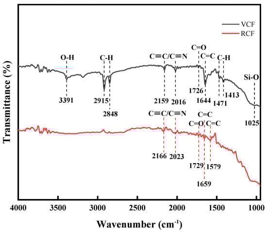 Figure 6 illustrates the infrared spectra of RCF and VCF. For RCF, stretching vibration peaks associated with alkynes (C≡C) or nitriles (C≡N) appear at 2166 cm−1 and 2023 cm−1, suggesting the presence of small amounts of conjugated alkyne (C≡C) or nitrile (C≡N) groups on the carbon fiber surface, typically introduced during high-temperature processing [38]. A stretching vibration peak of the carbonyl group (C=O) from carboxylic acid appears at 1729 cm−1 [39,40], while the absorption peaks at 1659 cm−1 and 1579 cm−1 correspond to the stretching vibrations of C=C bonds in the aromatic ring structure of the carbon fiber [41].