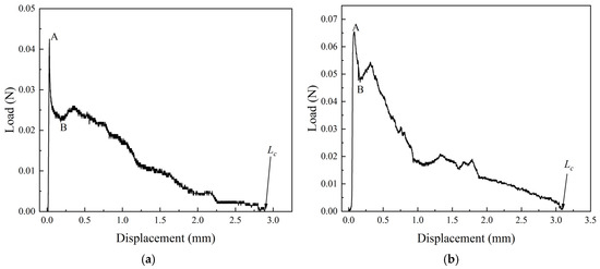 The typical successful single-fiber pull-out load–displacement curves for RCF and VCF specimens are shown in Figure 9. The fiber pull-out process can be divided into three main stages: elastic elongation, debonding, and slippage. In the first stage, the carbon fiber undergoes elastic stretching under tensile force before complete debonding occurs. As the displacement increases, the pull-out load increases accordingly. The process then enters the debonding stage, where the load continues to rise until it reaches the peak load, Pa, at point A. Afterward, the load drops from Pa to Pb at point B, marking the transition from partial debonding to complete debonding. If the load suddenly drops sharply, it indicates the rupture of the chemical bond between the fiber and the matrix. Once the fiber is completely debonded, it entirely separates from the matrix, and slippage occurs inside the matrix, entering the slippage stage. In the slippage stage, the pull-out force is primarily provided by the friction at the interface. As the interface continuously breaks down, the load decreases gradually until it reaches zero. The pull-out load–displacement curve obtained in this experiment closely matches the curves reported in the literature. Lc in the figure is the depth of the fiber buried in the matrix.