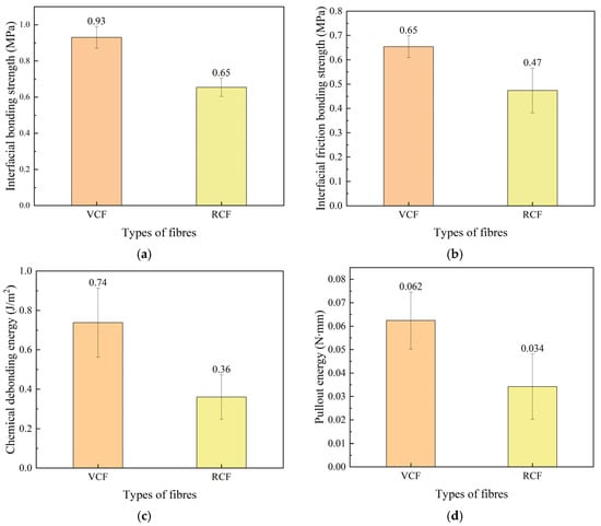 Interfacial bonding performance parameters of RCF and VCF with cement matrix. (a) Interfacial bonding strength. (b) Interfacial friction bonding strength. (c) Chemical debonding energy. (d) Pull-out energy.