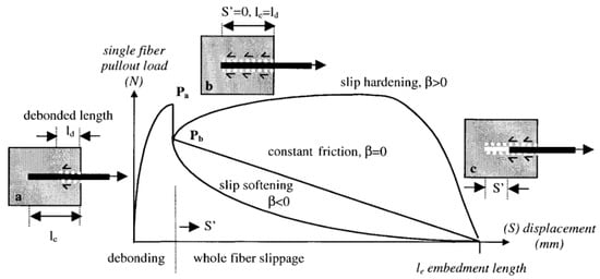 Starting from point Pb, the fiber is primarily influenced by the frictional force at the interface. Subsequently, the chemical debonding transitions to frictional bonding. The load Pb corresponds to the interfacial friction bonding strength, which can be calculated using Equation (3) [51].