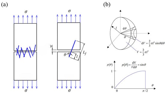 (a) Schematic diagram of fiber cementitious material cracking; (b) schematic diagram of probability function of fiber embedment angle distribution.