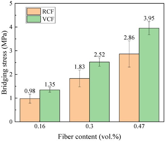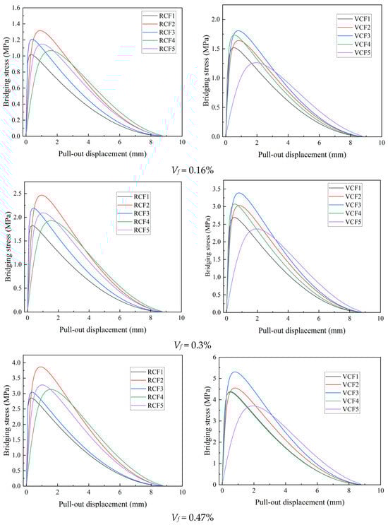 Figure 13 shows the fiber-bridging stress curves calculated using the theoretical model for different fiber dosages, with five data points for each parameter set. As shown in the figure, the bridging stress increases with the fiber dosage. Additionally, for the same fiber dosage, the bridging stress of VCF is higher than that of RCF. According to Equation (13), the theoretical bridging stress is primarily influenced by the peak pull-out load P0 and the slope k0 of the ascending segment of the pull-out curve. The larger the values of P0 and k0, the higher the theoretical bridging stress. From the results of the single-fiber pull-out tests, it is evident that the P0 and k0 values for VCF are greater than those for RCF, meaning that VCF exhibits a higher theoretical bridging stress than RCF. Moreover, according to Equation (13), when parameters such as Af, Lf, and f are the same, the theoretical bridging stress is determined by the fiber volume fraction Vf. As the fiber dosage increases, more fibers are distributed uniformly within the cement matrix, leading to a greater contribution of fibers in bridging the cracks in the matrix, thus enhancing the toughness. The bridging stress shown in Figure 13 is positively correlated with the tensile strength in Figure 5, meaning that the greater the bridging stress provided by the fibers, the higher the tensile strength of the cement-based material. The trends in both cases are consistent with changes in fiber content. The tensile test results validate the relationship between bridging stress and fiber content variation from the perspective of macro-mechanical performance.