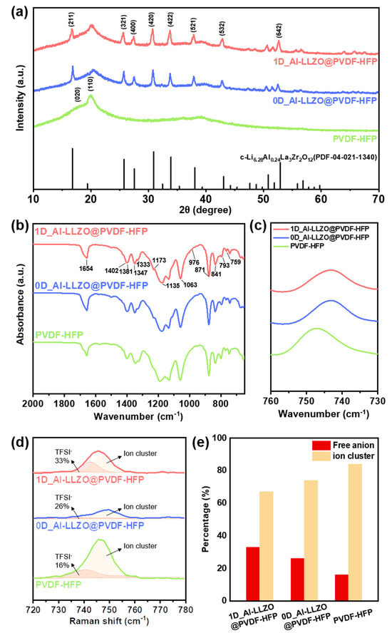(a) Comparison of XRD patterns of PVDF-HFP (PVDF-HFP/LiTFSI/SN), 0D_Al-LLZO@PVDF-HFP, and 1D_Al-LLZO@PVDF-HFP. (b) FT-IR spectra of PVDF-HFP (PVDF-HFP/LiTFSI/SN), 0D_Al-LLZO@PVDF-HFP, and 1D_Al-LLZO@PVDF-HFP and (c) characteristic peaks for PVDF-HFP (PVDF-HFP/LiTFSI/SN), 0D_Al-LLZO@PVDF-HFP, and 1D_Al-LLZO@PVDF-HFP in the wavenumber range of 730 cm−1 to 760 cm−1. (d) Raman spectra of PVDF-HFP, 0D_Al-LLZO@PVDF-HFP, and 1D_Al-LLZO@PVDF-HFP used to estimate the relative portion of free TFSI− (~740 cm−1) and ion clusters (~745 cm−1) in the composite electrolytes. (e) Comparison of free TFSI− and ion cluster ratios in PVDF-HFP (PVDF-HFP/LiTFSI/SN), 0D_Al-LLZO@PVDF-HFP, and 1D_Al-LLZO@PVDF-HFP, demonstrating enhanced lithium salt dissociation with Al-LLZO(1D) fillers.