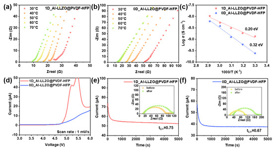 As displayed in Figure 3, the ionic conductivity (Figure 3a–c), electrochemical window (Figure 3d), polarization curves, and the Nyquist plot (Figure 3e,f) were obtained for the Al-LLZO@PVDF-HFP composite-based solid electrolytes (0D_Al-LLZO@PVDF-HFP and 1D_Al-LLZO@PVDF-HFP) for comparative analyses.