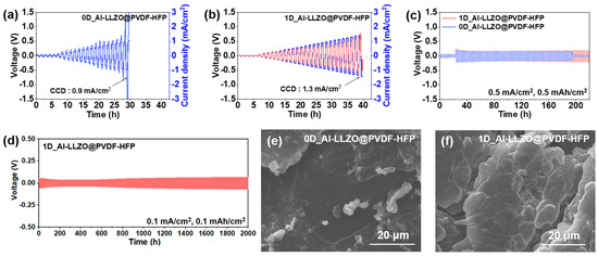 Galvanostatic cycling tests of the Li|0D_Al-LLZO@PVDF-HFP|Li and Li|1D_Al-LLZO@PVDF-HFP|Li symmetric cells with current density from 0.1 to 2.5 mA. Critical current density (CCD) test of (a) Li|0D_Al-LLZO@PVDF-HFP|Li and (b) Li|1D_Al-LLZO@PVDF-HFP|Li at 30 °C (blue line: current profile, red line: voltage profile). (c) Galvanostatic cycling tests of Li symmetric cells at a current density of 0.5 mA/cm2. (d) Long-term cycling performance of Li symmetric cells at a current density of 0.1 mA/cm2. SEM images of the lithium metal anode surfaces in Li symmetric cells after 220 h of cycling at 0.5 mA/cm2 assembled with (e) 0D_Al-LLZO@PVDF-HFP and (f) 1D_Al-LLZO@PVDF-HFP.