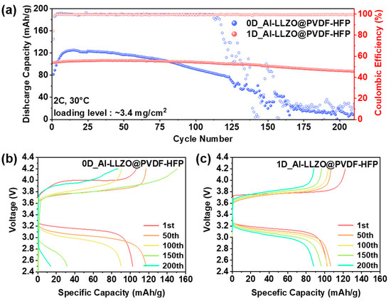 Figure 5 compares the EC performance of the full cell (Li|electrolyte|LFP) by adopting the composite electrolyte of 0D and 1D Al-LLZO@PVDF-HFP under 2.5–4.2 V and at 2C (1C = 170 mA/g). As displayed in the comparative cyclic performance (Figure 5a), the 1D_Al-LLZO@PVDF-HFP-based cell (Li|1D_Al-LLZO@PVDF-HFP|LFP) exhibited stable performance over 200 cycles, while the 0D_Al-LLZO@PVDF-HFP-based cell experienced a short circuit after 125 cycles. In addition, the 1D_Al-LLZO@PVDF-HFP electrolyte-based cell demonstrated an excellent capacity for retention (C/C0: 85.7% after 200 cycles), with a high coulombic efficiency of 99.4%. Such EC performances were further compared with voltage profiles of LFP with 0D and 1D-based composite electrolytes obtained at various cycles (Figure 5b,c). As displayed in the voltage profiles for the LFP cathode adopting 0D_Al-LLZO@PVDF-HFP (Figure 5b) and 1D_Al-LLZO@PVDF-HFP (Figure 5c) as an electrolyte, 1D_Al-LLZO@PVDF-HFP showed a higher initial specific capacity of 102.7 mAh/g than that of 0D_Al-LLZO@PVDF-HFP (81.5 mAh/g). Specifically, the LFP cathode with 0D_Al-LLZO@PVDF-HFP exhibited an unstable voltage profile with a drastic capacity decay and increased voltage polarization at elongated cycles, while the cathode with 1D_Al-LLZO@PVDF-HFP demonstrated a stable voltage profile and stable plateaus after 200 cycles without side reactions or drastic capacity decay. It is important to note that 0D_Al-LLZO@PVDF-HFP exhibited a higher capacity in the early cycles due to facilitated lithium-ion transport, facile lithium salt dissociation, and larger active area due to nanoparticles in the composite. However, the agglomeration tendency of nanoparticles in the polymer induced non-uniform defects and interfaces within the composite, leading to capacity degradation and short circuits due to promoted lithium dendrites over cycles [65]. In contrast, 1D_Al-LLZO@PVDF-HFP with a continuous 1D network structure can facilitate lithium-ion transport due to a paved 1D ion transport channel, promoting uniform lithium stripping and plating at elongated cycles. Specifically, the minimized structural defects and sustained ion-conducting channels by nanowires can effectively suppress Li dendrite growth, ensuring long-term stability [82]. Additionally, nanowire fillers with strong Lewis acid–base interaction with lithium-ion vacancies further enhance lithium-ion dissociation and transport within the composite [81]. Consistent with comparative CCD analyses of the electrolytes (Figure 4), the nanowire filler-based composite electrolyte (1D_Al-LLZO@PVDF-HFP) demonstrates superior electrochemical performance (long-term cycle stability) compared to 0D_Al-LLZO@PVDF-HFP, effectively facilitating channel formation within the composite and minimizing structural defects [86].
