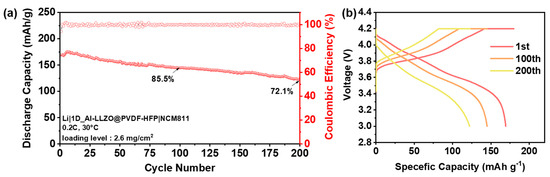 (a) Cycling performance of the Li|1D_Al-LLZO@PVDF-HFP|NCM811 cell at 0.2C (1C = 215 mAh/g, loading level: 2.6 mg/cm2). Solid red dots represent the voltage profile, and hollow red dots indicate the Coulombic efficiency (%) corresponding to the right y-axis. (b) Voltage profile of 1D_Al-LLZO@PVDF-HFP at initial (1st) and subsequent cycles (100th, 200th cycle).