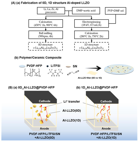 Scheme 1(Aa) illustrates the synthesis process of Al-LLZO with different structures (Al-LLZO (0D) and Al-LLZO (1D)) using precursors of inorganic (Li, La, Zr, and Al) salts. The 0D nanoparticle structure is synthesized via the sol-gel method, followed by a calcination process and subsequent ball milling, while the 1D nanowire structure is obtained through an electrospinning process, followed by a consecutive sintering step. Scheme 1(Ab) presents the compositing process of the electrolyte, where the sintered 0D and 1D Al-LLZO are dispersed into a PVDF-HFP matrix to fabricate the 0D or 1D Al-LLZO@PVDF-HFP (Al-LLZO/PVDF-HFP/LiTFSI/SN) solid electrolyte. It is important to note that a lithium salt (LiTFSI) and a plasticizer (succinonitrile, SN) were added to the PVDF-HFP matrix, contributing to the reduced crystallinity of PVDF-HFP, facile dissociation of LiTFSI, and improved interfacial stability with lithium metal through the molecular interaction of Li+ and the nitrile group (-S≡N-) [60,61,62]. Thus, the decomposed lithium salts act as a Lewis acid in the polymer, enabling diversified lithium transport channels during the electrochemical charge/discharges [63].