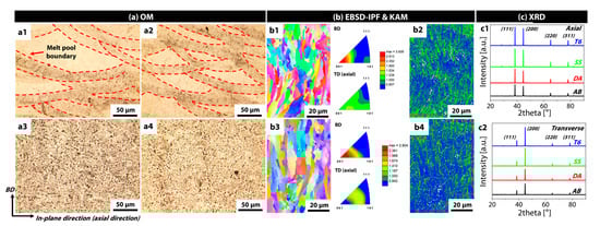 (a) Optical micrographs of each sample ((a1): AB, (a2): DA, (a3): SS, (a4): T6); (b) EBSD IPF maps and KAM maps ((b1,b2): AB; (b3,b4): SS); (c) XRD spectra measured in the (c1) axial (perpendicular to the build direction) and (c2) transverse (parallel to the build direction) orientations for each sample (black: AB, red: DA, green: SS, blue: T6).