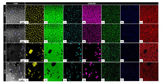 The STEM and EDS analyses of the chemical composition showed prominent eutectic Si-rich network structures inside the melt-pool boundary of the AB and DA specimens (Figure 2a,b). In the DA sample in particular, Mg was also found to be enriched along these Si-containing networks, suggesting that Mg diffuses during aging through the fine solidification structure established in the as-built state. By contrast, in the SS and T6 specimens, the high-temperature solid-solution process dissolved Si more uniformly into the aluminum matrix, largely eliminating the eutectic structure seen in the AB and DA samples (Figure 2c,d). Instead, Si, Cu, and Mg clustered into coarser precipitates in certain regions, likely because solute elements were rearranged during cooling and aging, precipitating at specific temperature intervals to form relatively large particles. The EDS point scanning results (at.%) for precipitates under different heat treatment conditions are summarized in Table 3. In the AB condition, precipitates (P2) showed high Si concentrations (82.79%), while the net-like region (P1) was Al-rich (74.92%) with minor amounts of Cu and Mg. After direct aging (DA), the precipitate (P2) composition revealed a more balanced Si (36.06%) and Mg (10.41%) content. For the SS and T6 conditions, further redistribution of Si and Mg was observed. Especially notable was the high Si enrichment (86.98%) in the enlarged T6-treated precipitate (P1) and the increased Mg content (20.42%) in another precipitate (P3). These observations clearly demonstrate the significant influence of heat treatment processes on elemental redistribution and phase evolution.