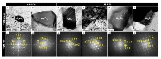 Morphology of the precipitates and their HRTEM-based FFT patterns observed in (a1–b2) AB and DA and (c1–f2) SS and T6.