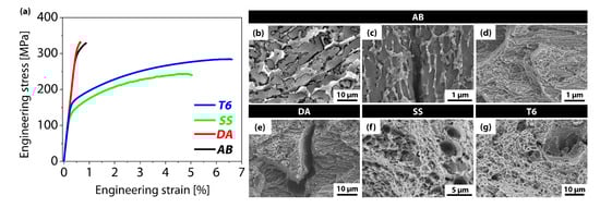 Fractography observation showed that secondary cracks and quasi-cleavage fracture were prevalent in the AB and DA specimens (Figure 4b–e). In particular, microcracks tended to initiate and propagate around the net-shaped eutectic Si formed during the additive process, causing pronounced brittle behavior (Figure 4b,c). By contrast, the SS and T6 specimens, which underwent high-temperature solid-solution treatment to rearrange the microstructure, exhibited a dimple structure on the fracture surfaces, confirming that ductile fracture was the dominant mode (Figure 4f,g). This result is interpreted as arising from the more uniform dissolution of Si into the aluminum matrix during the solution treatment, along with finely dispersed precipitates formed during aging, which do not concentrate in localized regions, thus reducing potential crack initiation sites. Consequently, the SS specimen significantly improved elongation solely through the solution treatment, while the T6 specimen additionally achieved moderate precipitation strengthening, attaining a high ductility–strength balance.