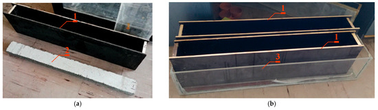 In the next stage, 4 tanks for NaCl solution were constructed from shuttering plywood with dimensions of 17 × 250 × 1500 mm. The shuttering plywood ensured adequate rigidity and tightness of the tanks. Figure 2a shows the finished container 1 to be mounted on the prestressed concrete beam 2. The finished containers were attached to the wider surface of the beams on the side of the smaller concrete lagging, and then the edges of the joint were sealed using a flexible polymer adhesive. In Figure 2b, the finished samples prepared for migration testing are shown placed in a sealed container 3 made of Plexiglas plates.