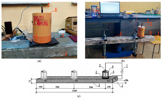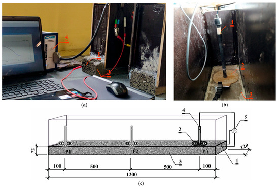 The measurements followed a three-electrode setup, employing a tension string as the working electrode (1). Counter electrode (2), made of a circle-shaped stainless steel sheet with a hole in the center, was applied to the surface of the tested prestressed beams (3) on the thinner side of the concrete lagging through a damp felt spacer (4) to ensure electrical connection. A reference electrode (5) of Cl−/AgCl,Ag composition was placed in the hole of the auxiliary electrode on the surface of the test beam. The elongated shape of the reference electrode (5) allows it to pass through the hole of the load elements (6), which presses the counter-electrode (2) against the spacer (4) and the surface of the beam (3) to ensure a good electrical connection. Reference electrode (5), together with counter-electrode (2) and load element (6), was applied at three measurement points: P1—10 cm from the left edge of the beam; P2—in the middle of the beam span; and P3—10 cm of the right edge of the beam. Each time, LPR tests were performed using a Gamry Reference 600 (7) potentiostat from Gamry Instruments, Warminster, PA, USA (Figure 9a–c).