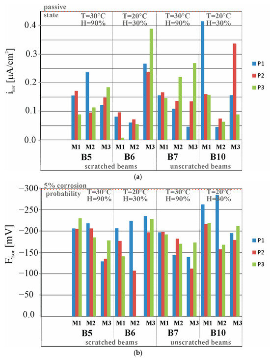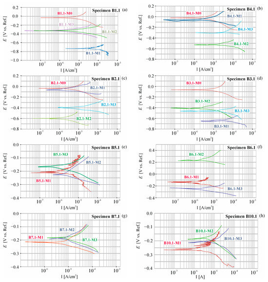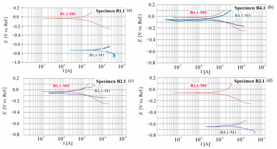 During the entire research period, a total of 24 polarization curves were obtained. The shapes of selected ones measured at point P1 of beams B1, B2, B3, and B4 are shown in Figure 10.