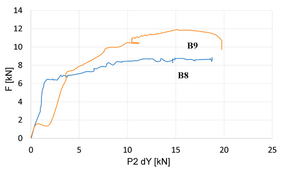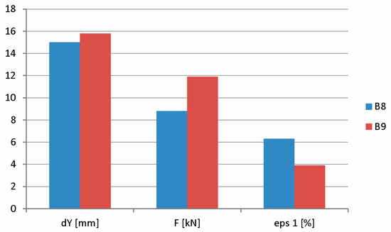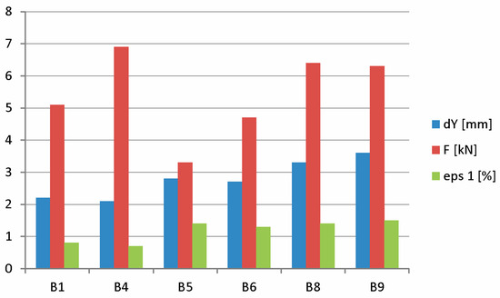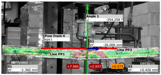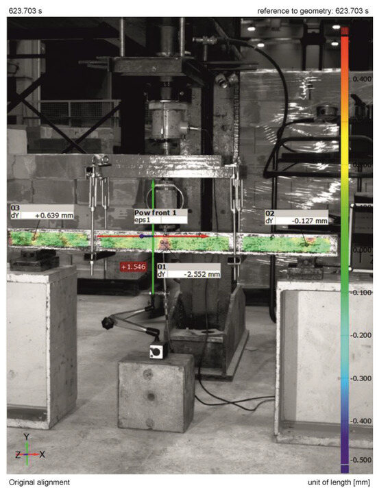 During destructive testing, the load P from the hydraulic cylinder (2) was transferred directly to the beam (1) (Figure 7b). During the tests, displacements and load force values were recorded using sensors (3) compatible with the computer (4). The Aramis system recorded images of the displacement field at a rate of four images per second. During the test, the Aramis (5) system’s cameras also recorded a monitor image that displayed measurement values from the displacement sensor and the force meter.
