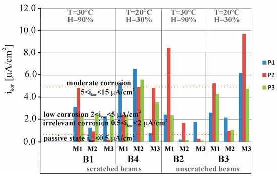 Figure 11 presents a comparison of results from 24 measurements of corrosion current density (icorr) of the reinforcement strings in beams B1, B2, B3, and B4 measured at three points (P1, P2, and P3) of these beams before the migration process (M0) and after 30 days of chloride ion migration (M1). The following criteria can be adopted to determine the degree of corrosion rate based on the measurement of corrosion current density: passive state for (icorr < 0.5 µA), irrelevant corrosion for (0.5 < icorr < 2 µA), low corrosion for (2 < icorr < 5 µA), moderate corrosion for (5 < icorr < 15 µA), and high corrosion for (icorr > 15 µA) [34,36,37]. The first reference study (M0) indicates that the average value of the corrosion current measured at three points, P1, P2, and P3, of the beams B1, B2, B3, and B4 is icorr = 0.4 < 0.5 µA, which indicates the passive state of the tested elements. Subsequent tests (M1) performed after 30 days of chloride ion migration indicate that the average value of corrosion current intensity measured at three points, P1, P2, and P3, of the beams B1, B2, B3, and B4 is icorr = 3.8 < 5 µA, which indicates a low state of corrosion of the studied elements.