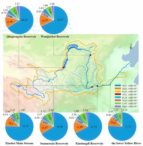 The protection and sustainable management of the Yellow River is a long-term strategic priority crucial to the socioeconomic development and ecological stability of China. The Yellow River Basin faces severe sedimentation challenges due to factors such as low water discharge, excessive sediment load, and an imbalanced water–sediment relationship. Sediment deposition is a persistent technical issue affecting flood control measures, reservoir storage capacity, and the operational efficiency of irrigation systems. Meanwhile, the demand for construction aggregates in China is enormous, with approximately 20 billion tons of sand and gravel consumed annually [1]. The depletion of natural sand resources has necessitated the exploration of alternative materials with stable supply potential [2,3]. In this context, Yellow River sediment has emerged as a promising substitute due to its abundance and economic viability. The primary constituent of Yellow River sediment is silicon dioxide (SiO2) (Figure 1), which makes it a viable alternative for cementitious applications. Utilizing Yellow River sediment in construction materials offers substantial environmental and economic benefits.