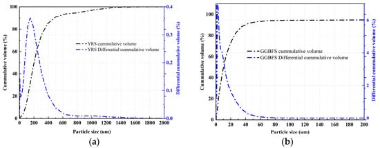 Particle-size distribution curves of YRS and GGBS. (a) YRS, (b) GGBFS.