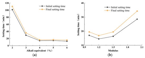 Effect of alkali activator characteristic parameters on setting time for (a) alkali equivalent and (b) modulus.