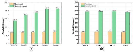 Effect of alkali activator characteristic parameters on workability for (a) alkali equivalent and (b) modulus.