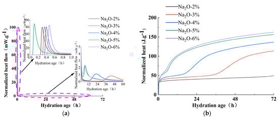As observed in Figure 5b, an increase in alkali equivalent notably enhances the hydration heat release of the mixture. After 24 h, the cumulative heat releases for mixtures with Na2O contents of 2%, 3%, 4%, 5%, and 6% are recorded as 40.4 J/g, 47.2 J/g, 80.8 J/g, 122.5 J/g, and 126.8 J/g, respectively, demonstrating a progressive rise in exothermic activity with higher alkali dosages. The hydration heat release increases with the increase in alkali equivalent. After 72 h of cumulative heat release, the hydration heat releases for 2% to 6% Na2O mixtures are 49.8 J/g, 113.9 J/g, 136.6 J/g, 156.4 J/g, and 162.4 J/g, respectively. Overall, the hydration heat release rate is the fastest for the 3% Na2O mixture, but the total hydration heat release is still lower than that of high-alkali pastes. The hydration heat releases for 4% to 6% Na2O pastes are 19.95%, 37.36%, and 42.59% higher than that of the 3% Na2O paste, respectively. When the Na2O content exceeds 5%, the change in hydration heat release is minimal, which aligns with the strength-development pattern.