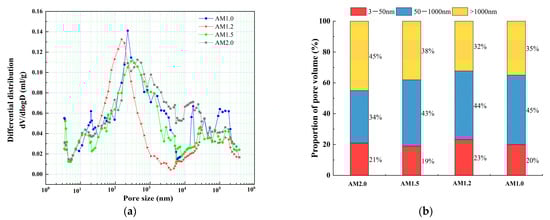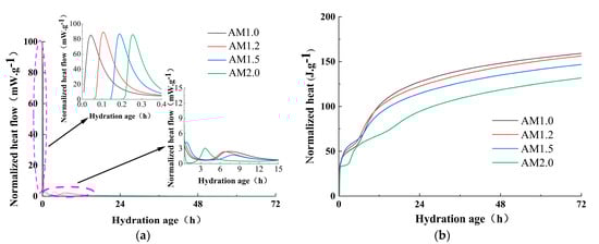 Figure 6b shows that reducing the activator modulus significantly increases the hydration heat release of the mixture. After 24 h, the cumulative heat release for AM2.0 to AM1.0 mixtures is 94.5 J/g, 114.5 J/g, 122.5 J/g, and 127.5 J/g, respectively, indicating a progressive increase in hydration heat release as the activator modulus decreases. After 72 h, the cumulative hydration heat releases for AM2.0 to AM1.0 mixtures are 131.8 J/g, 146.9 J/g, 156.4 J/g, and 159.2 J/g, respectively. While the AM2.0 mixture exhibits the fastest hydration heat release rate, its total cumulative hydration heat release is lower than that of mixtures with lower activator moduli. The hydration heat releases for AM1.0 to AM1.5 mixtures are 20.74%, 18.65%, and 11.40% higher than that of the AM2.0 mixture, respectively. When the activator modulus is below 1.2, the change in hydration heat release is minimal, which aligns with the strength-development pattern.