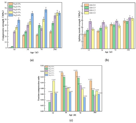 Effects of alkali activator modulus on strength for (a) compressive strength, (b) splitting tensile strength, and (c) tension–compression ratio.