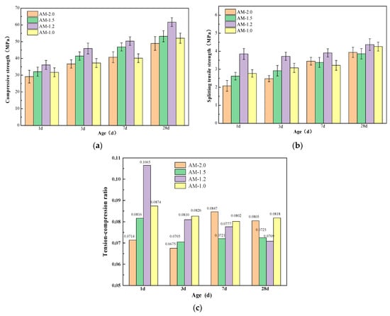 As the curing age continues to increase, the strengths of specimens with different moduli show a certain degree of improvement. Comparatively, the AM1.2 specimen exhibits the highest compressive and splitting tensile strengths at different curing ages. After 28 days of standard curing, the compressive strengths of AM2.0~1.0 specimens are 48.96 MPa, 53.24 MPa, 61.68 MPa, and 52.11 MPa, respectively, while the splitting tensile strengths are 3.94 MPa, 3.86 MPa, 4.37 MPa, and 4.26 MPa, respectively. The compressive strength of the AM1.2 specimen is 25.98%, 15.85%, and 18.36% higher than those of AM2.0, AM1.5, and AM1.0, respectively, and the splitting tensile strength is 10.91%, 13.21%, and 2.58% higher than those of AM2.0, AM1.5, and AM1.0, respectively. From Figure 8c, it can be seen that at 1 day, the AM1.2 specimen has a significantly higher mix ratio compared to the other specimens. As the curing age increases, the growth rates of compressive strength in the AM1.2 and AM1.0 specimens are higher than those of splitting tensile strength, resulting in a certain degree of decrease in the tensile-to-compressive strength ratio. After 28 days of standard curing, the tensile-to-compressive strength ratios of the AM2.0 and AM1.5 specimens are slightly higher than those of AM1.2 and AM1.0.