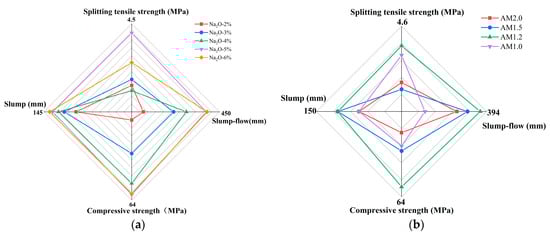 Based on the experimental results, this study selected four indicators, compressive strength, splitting tensile strength, slump, and spread, and conducted a comparative analysis using a four-dimensional evaluation method [52]. Through multi-dimensional evaluation, the optimal parameters for alkali-activation control were proposed. The multi-dimensional evaluation of eco-friendly cementitious materials made from YRS under different alkali equivalents and activator moduli is shown in Figure 9. As can be seen from the figure, when the Na2O content is 5% and the activator modulus (AM) is 1.2, the workability and strength of the eco-friendly cementitious materials achieve a good balance. This is because an appropriate alkali equivalent and activator modulus can promote the rapid dissolution of raw materials, reduce the cohesion of the mixture paste, and improve the flowability of the mixture. On the other hand, the potential reactivity of slag is fully activated in a suitable alkaline environment, enabling the orderly development of matrix strength and avoiding issues such as insufficient strength growth due to under-activation or strength decline in later stages due to over-activation. This facilitates the smooth progression of the “depolymerization–polycondensation” reaction.