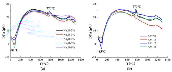 Alkali equivalent and modulus differential thermal analysis (DTA) curves. (a) Alkali equivalent, (b) modulus.
