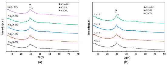 Figure 11a,b show the XRD patterns of matrix under different alkali equivalents and moduli, respectively. To avoid the influence of impurities and minerals in the sediment on the products, the sample preparation involved using a paste sample with the sediment removed. As can be seen from the figures, in both Figure 11a,b, the phases in the groups were similarly composed of amorphous gel. The peaks observed between the diffraction angles of 20°–40° are indicative of C-A-S-H, C-S-H, and CaCO3 in calcium-containing systems [53,54]. It can be found that the alkali equivalent and alkali modulus only affects the content of matrix products and does not cause the formation of new products. With the increase of alkali equivalent and alkali modulus, the peak intensities of C-(A)-S-H and CaCO3 increase.