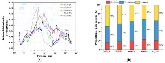 Overall, the mechanical properties of eco-friendly cementitious materials made from YRS show a trend of first increasing and then decreasing with an increase in alkali equivalent [48]. Within a certain range, increasing the alkali equivalent can better dissolve silicon–aluminum raw materials, fully activating the potential reactivity of slag [49,50]. However, an excessively high alkali equivalent leads to an overabundance of OH− in the system and premature deposition of silicate–aluminate products [44], hindering the normal progress of the polymerization reaction [51]. At the same time, the presence of too many alkali metal ions (M+) in the structure affects the electronegativity of the structure, impeding its formation.