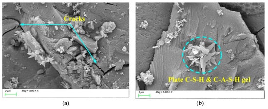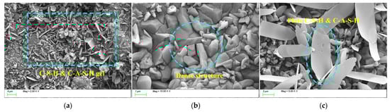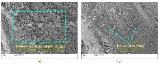 The microstructure of the cement paste samples was observed using a Sigma 300 field emission environmental scanning electron microscope (Carl Zeiss AG, Oberkochen, Germany). After curing to the 28d age, the samples were broken with pliers, and hydration was stopped before testing [38].