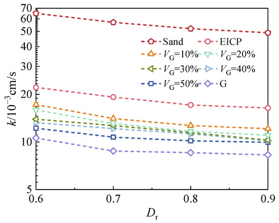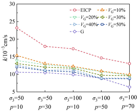 - All reinforced soil specimens exhibited lower permeability coefficients than the untreated soil. The permeability coefficient gradually decreased with increasing relative density (Dr), glutinous rice slurry volume content (VG), seepage pressure (p), and confining pressure (σ3). Notably, more pronounced variations in permeability were observed during the initial stages of lower Dr and smaller VG.