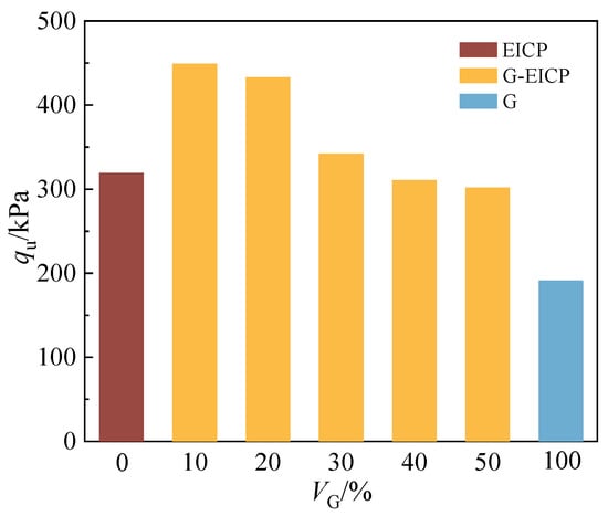 - Significant differences in permeability and strength characteristics were observed in G-EICP-reinforced soil under varying glutinous rice slurry volume ratios. Specimens with low slurry ratios (VG = 0~20%) demonstrated superior strength performance, reaching a maximum unconfined compressive strength of 449.2 kPa at VG = 10%. Comparative analysis revealed that EICP-reinforced soil exhibited higher strength than G-reinforced soil when applied separately.