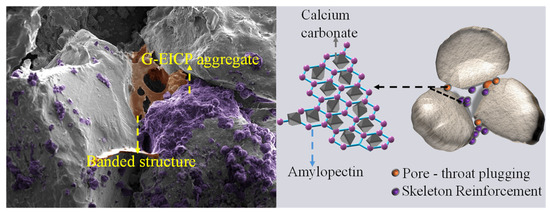 - Microstructural analysis demonstrated that glutinous rice slurry particles serve as nucleation sites for calcium carbonate precipitation in G-EICP-reinforced soil. This mechanism regulates the morphology, size distribution, and spatial arrangement of calcium carbonate crystals, forming distinctive slurry−calcium carbonate aggregates. These aggregates appear to contribute to soil stability, possibly through two mechanisms: “pore throat clogging” that reduces permeability and “skeleton reinforcement”, which improves structural integrity.