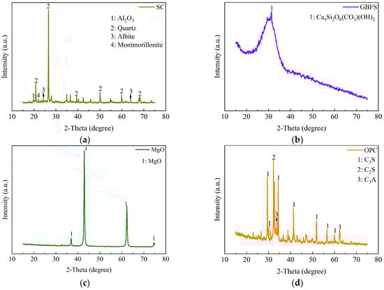XRD analysis of SC, GBFS, MgO, and OPC. (a) SC; (b) GBFS; (c) MgO; (d) OPC.