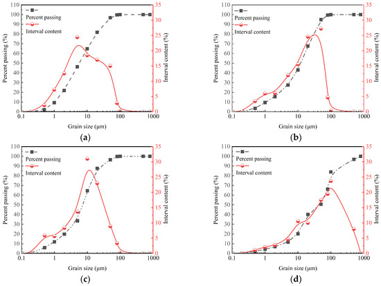 The mineral compositions of SC, GBFS, MgO, and OPC tested by X-ray diffraction (XRD) are illustrated in Figure 3. The XRD pattern of the GBFS reveals the presence of a complex calcium silicate mineral with the chemical formula Ca4Si2O6(CO3)(OH)2. The XRD pattern of the clay reveals the presence of SiO2, Al2O3, and montmorillonite. Montmorillonite exhibits the property of expanding in volume when exposed to water. The strong and sharp peak at 2θ = 42.9° indicates the high crystallinity of the MgO phase. The XRD pattern of the OPC reveals the presence of C3S (3CaO·SiO2), C2S (2CaO·SiO2), and C3A (3CaO·Al2O3). These minerals play a crucial role in the hydration and setting behavior of OPC. The particle size distributions of SC, GBFS, MgO, and OPC were measured with a Bettersize 2000LD laser particle size distribution meter, as shown in Figure 4. In the clay, the content of the fraction of clay (less than 2 µm), silt (2 µm~50 µm), and sand (50 µm~2000 µm) was 21.9%, 74.95%, and 3.14%, respectively [30]. Particle size analysis indicated that 49.35% of the particles in OPC were distributed within the range from 50 to 2000 µm, whereas the particles in GBFS and MgO were primarily concentrated within the range from 2 to 50 µm, accounting for 79.3% and 76.54%, respectively. The smaller particle size not only effectively fills the pores between the clay particles, but its larger specific surface area also significantly promotes the hydration reaction [20,21]. We conducted a particle size analysis on the SC, GBFS, MgO, and OPC to determine the particle size distribution range and the dimensions of the materials utilized in the experiment. The laser particle size distribution meter used in this study is manufactured by Dandong Baite Instrument Co., Ltd., which is located in Dandong City, Dandong, Liaoning Province, China.