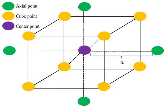 Figure 6 illustrates the distribution of test points for the three-factor, five-level CCD. In the preliminary test results of Section 2.2.1, it was determined that the content of GBFS accounts for 10.5~13.5% of the dry clay mass, the content of MgO accounts for 1.5~4.5% of the clay soil mass, and the content of BF accounts for 0.2~0.8% of the dry clay mass. The content range of these three curing materials is suitable for CCD. The encoding conversion can be determined using Equation (2). Based on the obtained design area, a CCD scheme was developed using the response surface design methodology. The independent variables and their coding levels for the rotating center combination design are shown in Table 5. In Table 5, −1 (10.5) corresponds to the coded and actual values of the materials in the curing materials, respectively. The total number of tests for CCD was given by the formula 2K + 2K + Mo, where 2K represents the cube points, 2K denotes the axial points, K is the number of experimental factors, and Mo indicates the central points. In the equation, the number of tests at the central points was set to six. The independent variables in the experiment included GBFS, MgO, and BF, resulting in a total of three independent variables. Therefore, the total number of tests required was 2K + 2K + Mo = 23 + 2 × 3 + 6 = 20. The central points were represented as zero; the coordinates of the cube points were represented as ±1; and the axial points were represented as ±α, where α was defined as α = 2k/4 = 23/4 = 1.682. In the axial points, k represented the number of independent experimental variables [42], which was set to three in this case. According to Equation (2), the CCD experimental ranges for GBFS, MgO, and BF were 9.48%~14.52%, 0.48%~5.52%, and 0%~1.00454% of the dry clay mass, respectively.