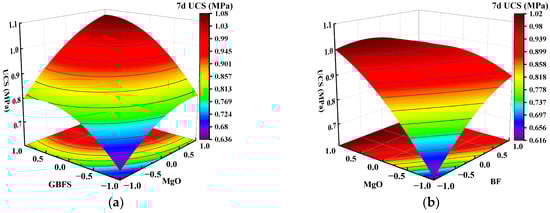 Effect of two-factor interactions on 7-day UCS. (a) GBFS content and MgO content; (b) MgO content and BF content.