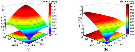 Effect of two-factor interactions on 28-day UCS. (a) GBFS content and MgO content; (b) MgO content and BF content.