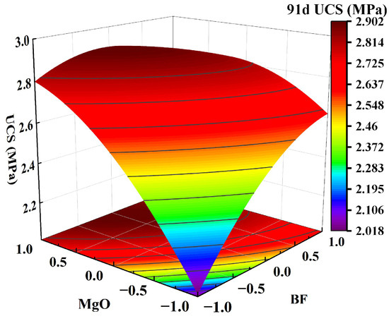 Effect of two-factor interactions on 91-day UCS: MgO content and BF content.