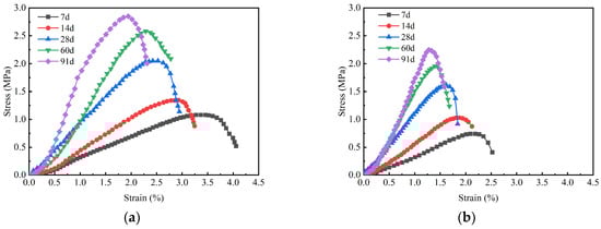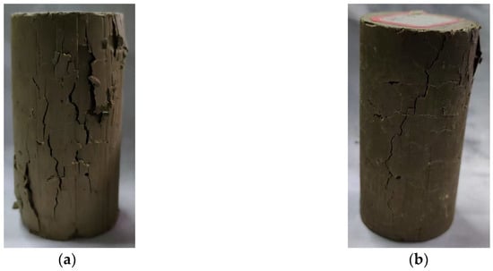 (II) Bridging effect: The bridging effect exerted by the right amount of basalt fibers improves the curing integrity. When the solidified clay was subjected to compression, the basalt fibers acted as a bridge to disperse the concentrated pressure, creating multiple ranges of common resistance. After the solidified clay reached its peak stress, the basalt fibers and hydration products gradually separated under external pressure but still maintained resistance to the external pressure, which led to the formation of multiple cracks (see Figure 10). Moreover, the stress in the solidified clay decreased slowly with increasing strain.