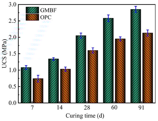 (2) The UCS values of GMBF solidified clay after 7 days, 28 days, and 91 days were 1.08 MPa, 2.05 MPa, and 2.85 MPa, respectively. At curing times of 7 days and 91 days, the UCS of GMBF solidified clay increased by 45.9% and 33.8% compared to OPC solidified clay, respectively.